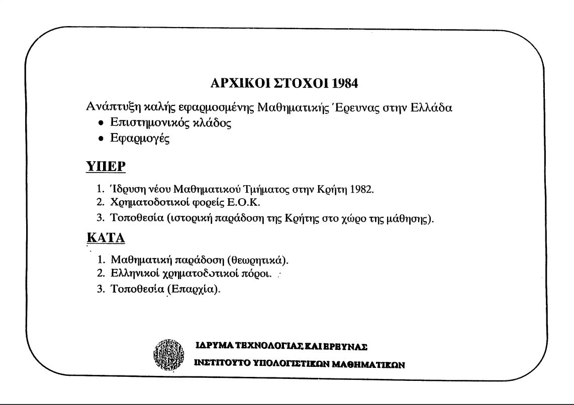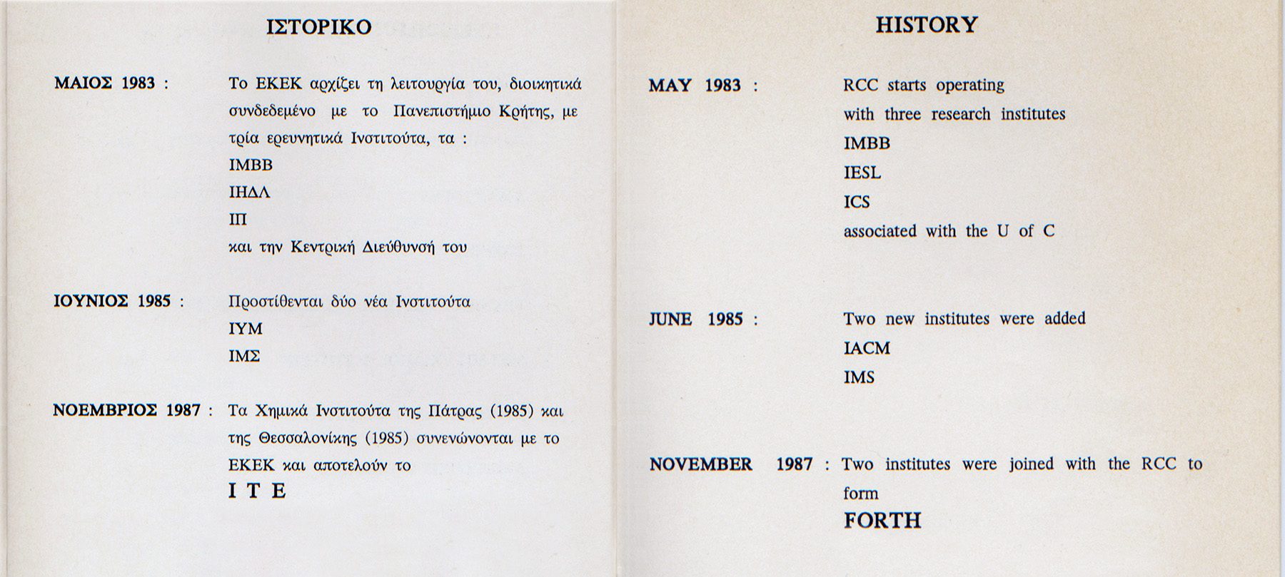 The FORTHistory 1983-2023 research project explores FORTH’s historical, institutional and scientific trajectories during the last forty years in Greece and abroad. It is conducted by a team of scholars collaborating with the Department of the History of Technology of the Institute for Mediterranean Studies (IMS-FORTH); it is headed by the Director of IMS-FORTH, Professor Gelina Harlaftis and directed by Dr Spyros Tzokas. In order to achieve the two-years’ research goal (2021-2023) that will lead to the publication of an anniversary volume, IMS-FORTH maintains an extensive collaboration with experts and researchers in History of Modern & Contemporary Science, Technology, Medicine (post-doctoral, doctoral and post-graduate fellows) of the Department of History and Philosophy of Science of the National Kapodistrian University of Athens and has the institutional academic support of the Department of History of the University of Crete.